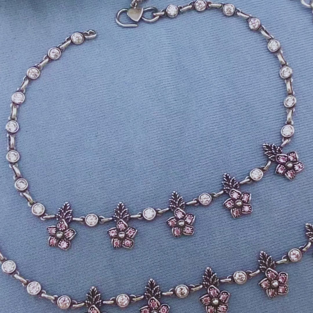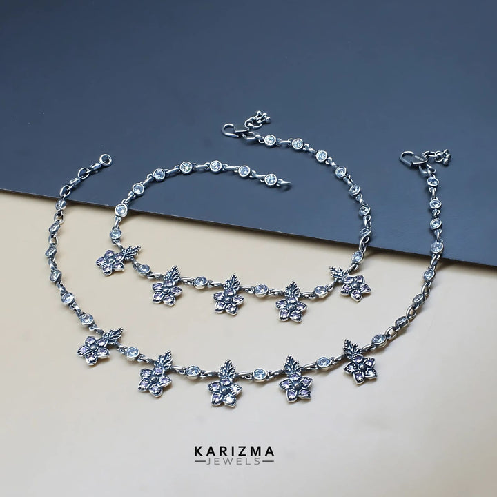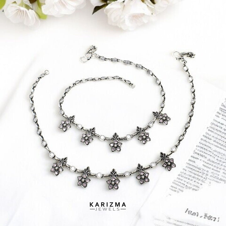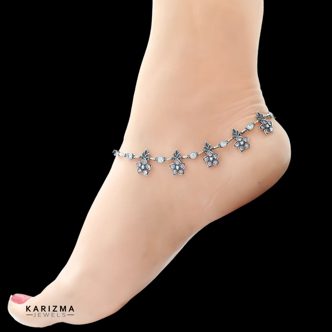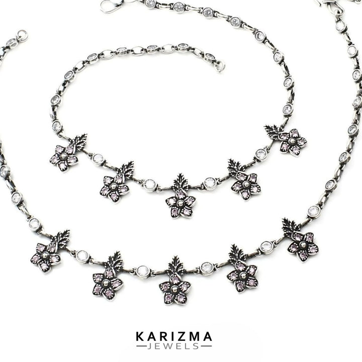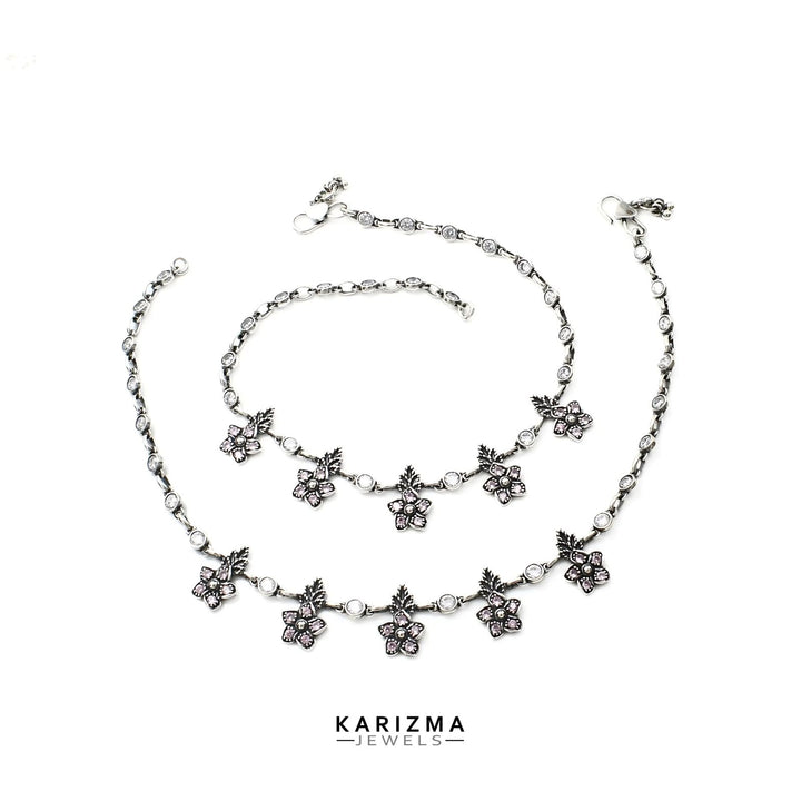 Add a touch of elegance to your feet with our gorgeous 925 Sterling Silver Pink White CZ floral design Oxidised Anklets Pair. Made with high-quality materials, these 10.7" anklets are the perfect combination of beauty and durability. Elevate your style with this stunning accessory.