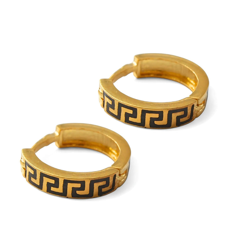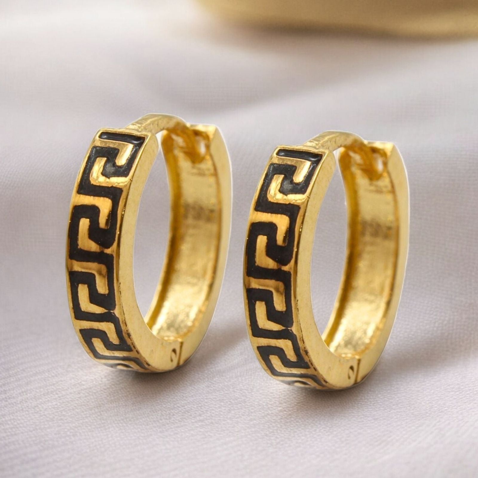 These Indian hinged hoop earrings feature a timeless Greek Key design crafted in 18k solid yellow gold. Their secure hinged closure ensures comfortable wear throughout the day, while the elegant pattern adds a touch of cultural sophistication to any outfit. Perfect for both everyday use and special occasions, these earrings combine durability with classic style.