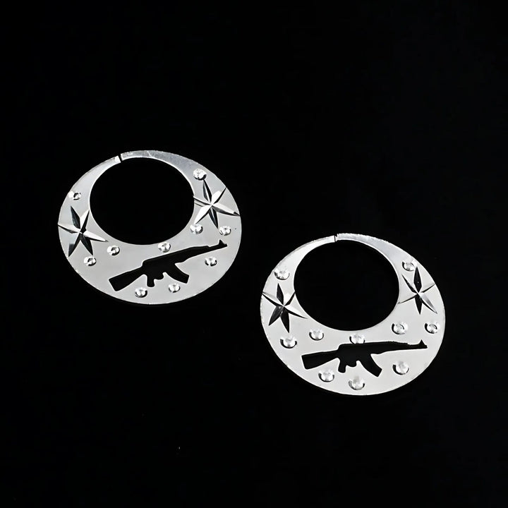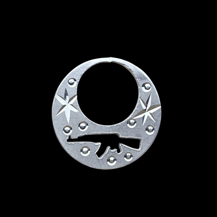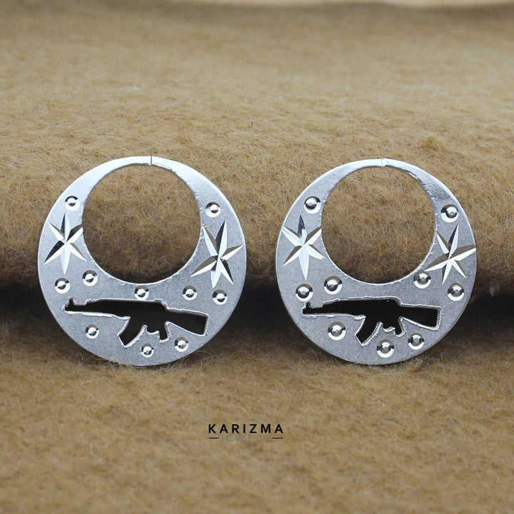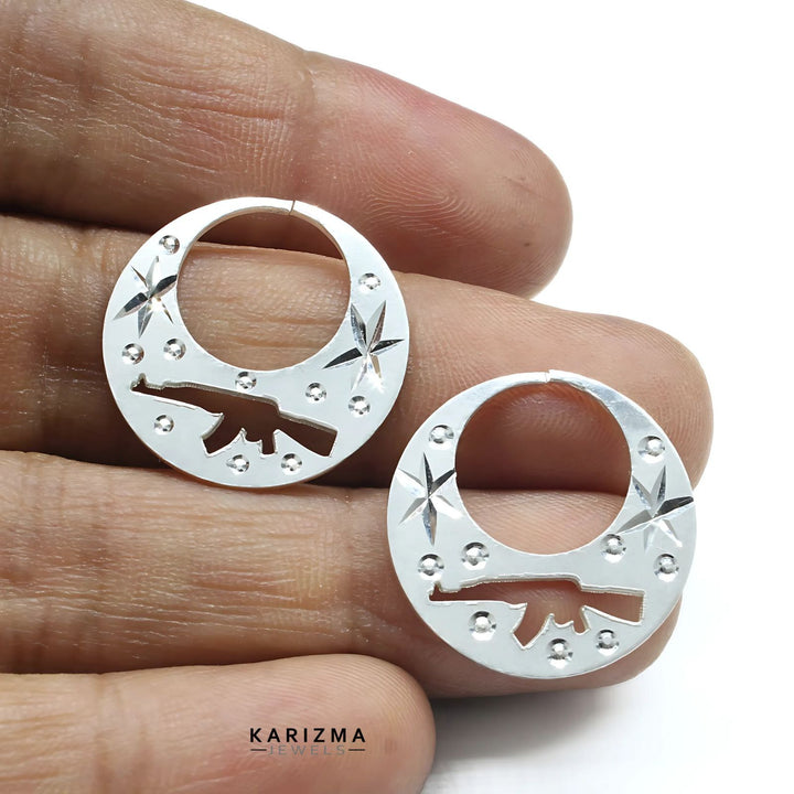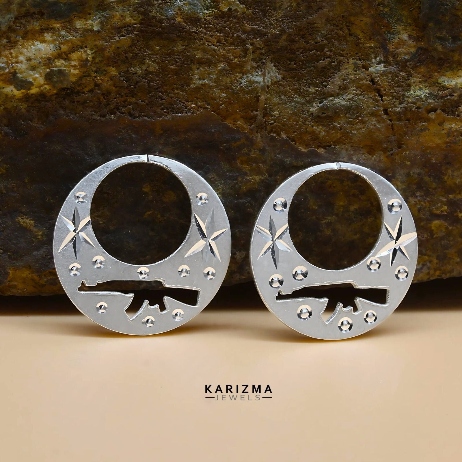 Upgrade your earring game with our Amazing Real Sterling Silver Round Moon Shaped Ak47 Nattiyan (Nanti) earring for Men. This unique piece features a sleek and modern design that will elevate any outfit. Made from genuine sterling silver, these earrings are not only stylish but also durable. Add a touch of masculinity to your look with these must-have earrings.
