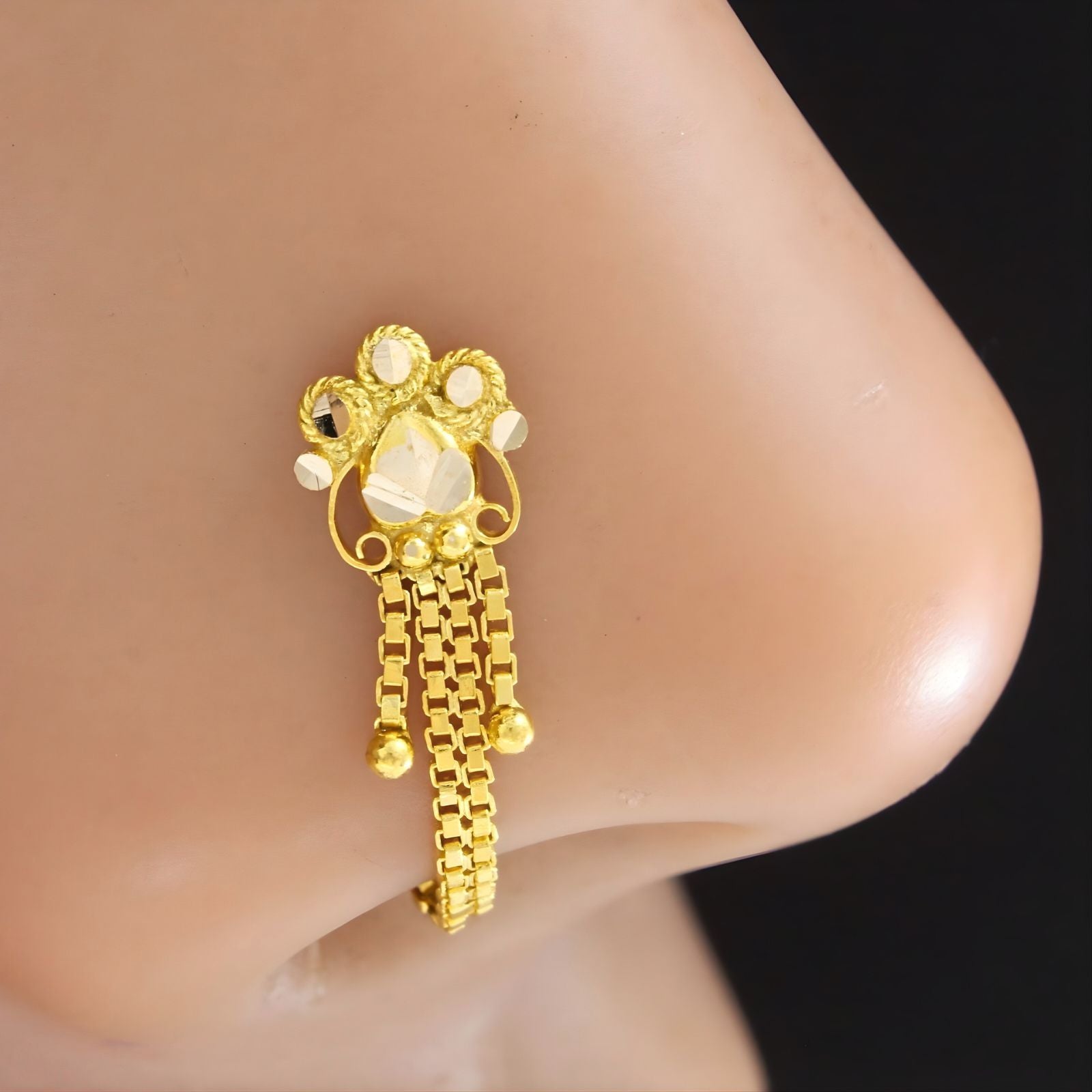 Elevate your festive look with this exquisite 14k real gold nose stud, crafted in a timeless Indian chain style. Perfect for parties and special occasions, this push pin design offers effortless comfort and secure wear throughout your celebration. The authentic gold construction ensures lasting brilliance and durability, making it a treasured addition to your jewelry collection. Whether you're attending weddings, festivals, or evening gatherings, this elegant nose stud brings traditional charm with contemporary sophistication. A versatile piece that complements both ethnic and modern ensembles with understated grace.