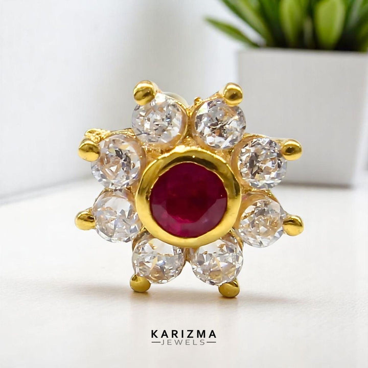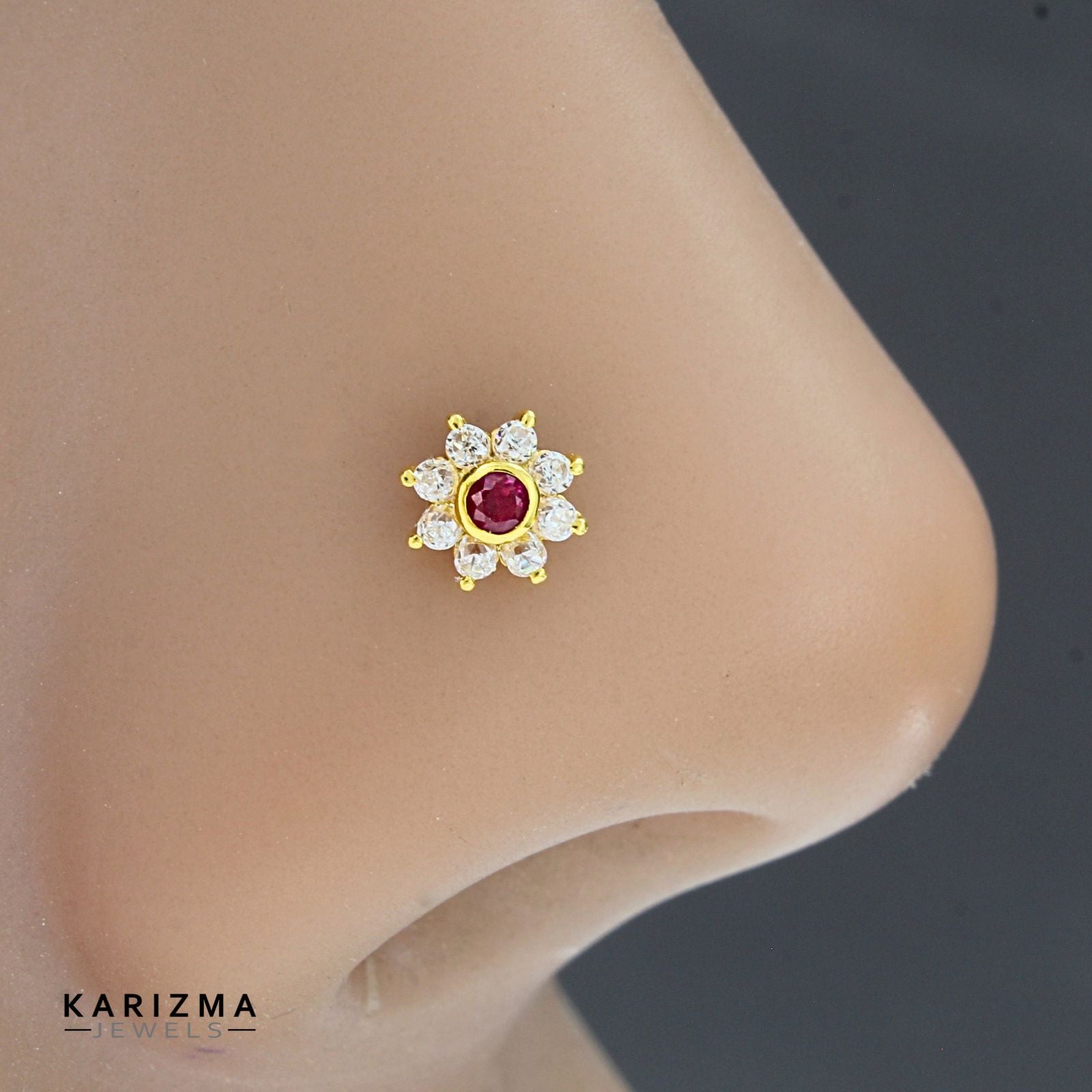 This 18K real gold nose stud adds a touch of elegance to any outfit. The star-shaped pink and white CZ design is both eye-catching and versatile. Comfortably push the pin into your nose for effortless style and a statement-making look. A must-have for any Indian woman.