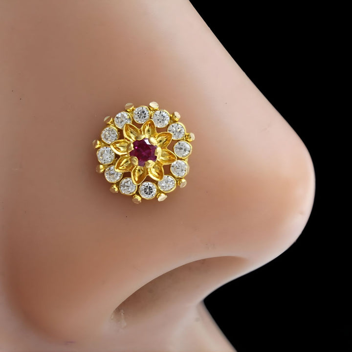 Experience elegance with this Divine 18K Real Gold Nose Stud featuring pink and white CZ stones in a secure push-pin design. Crafted from genuine 18K gold, it offers lasting shine and comfortable wear, ideal for sensitive skin. Its graceful floral-inspired look brings a subtle yet beautiful touch to any ensemble, perfect for daily wear or special occasions.