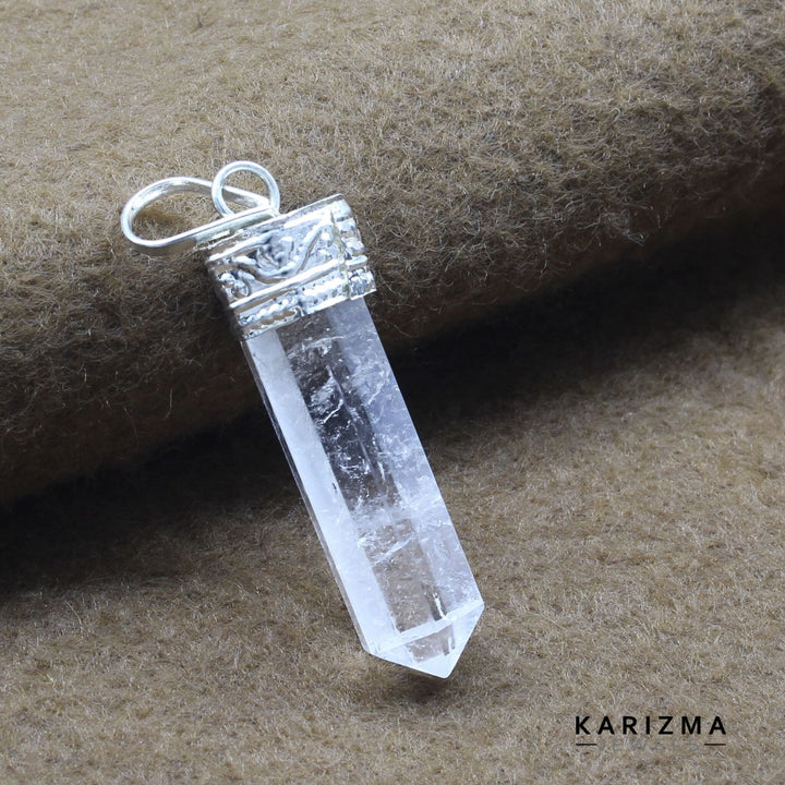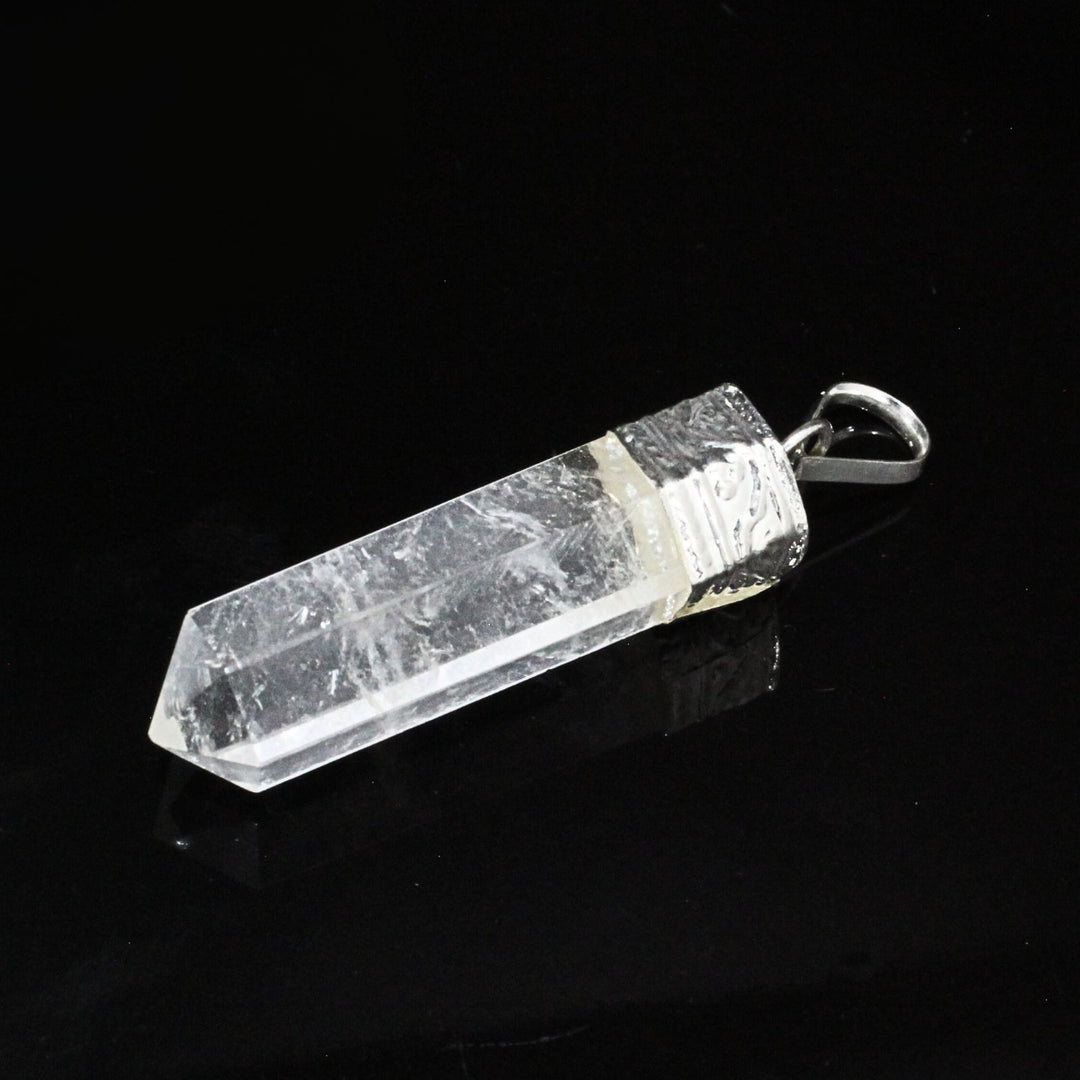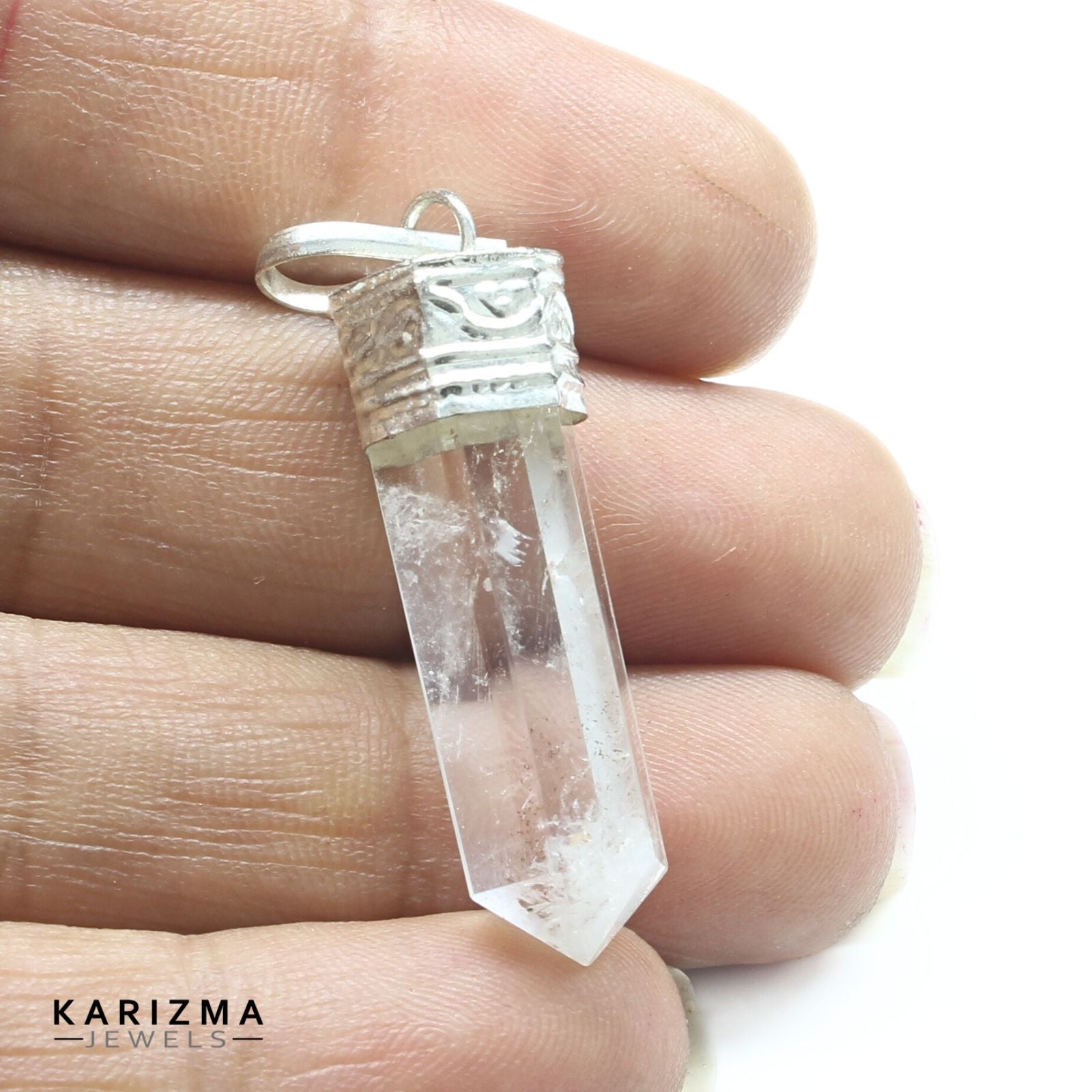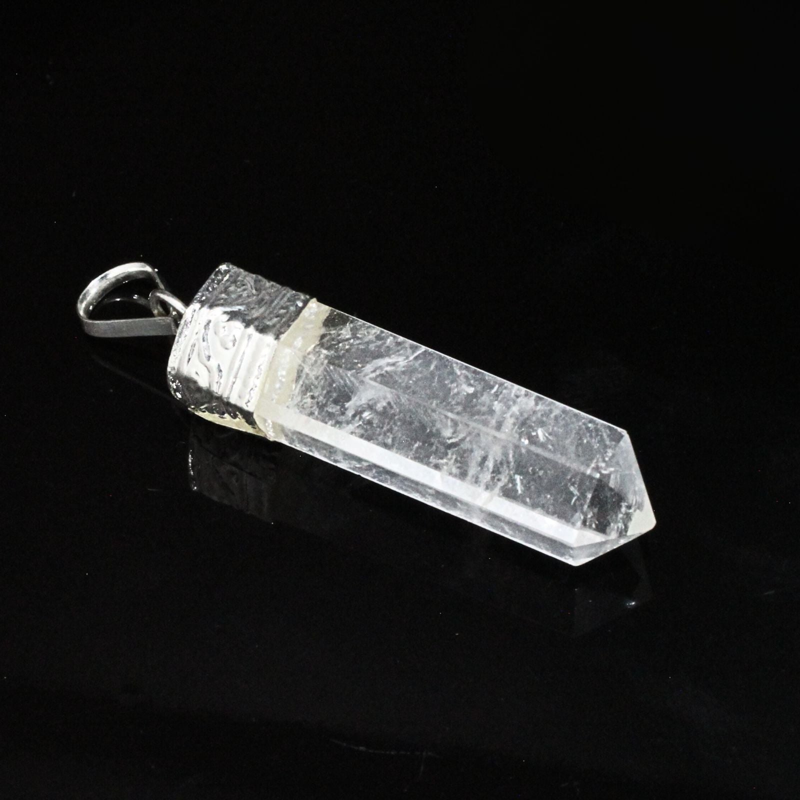 This beautiful pendant is crafted from natural quartz crystal and features a pointed design. Perfect for those seeking the healing properties of crystals, this pendant can be worn as a stylish accessory or used for its potential benefits. Embrace the power of nature with this stunning piece.