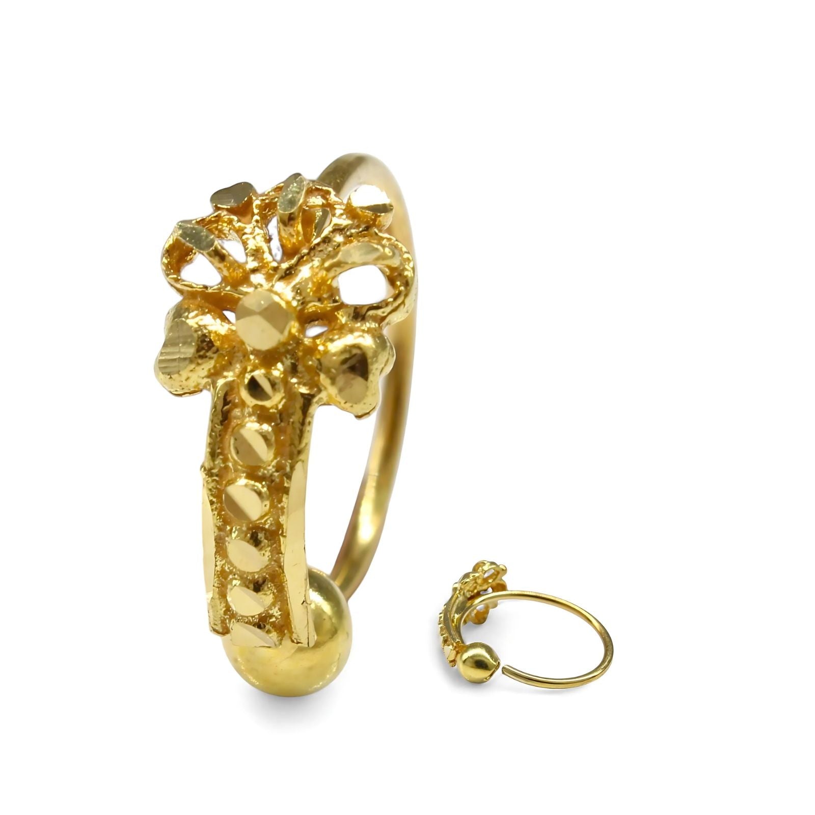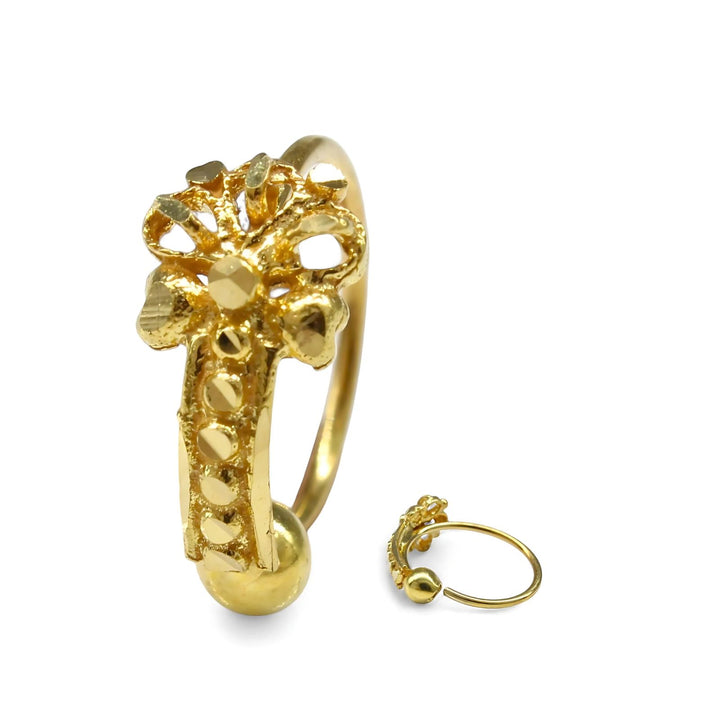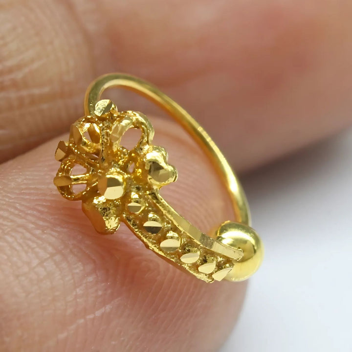 This 18K real gold nose ring showcases a beautiful cultural design, specially crafted for Indian women. With a 22-gauge thickness, it offers a comfortable fit while highlighting traditional elegance. Perfect for adding a meaningful touch to your style, this nose hoop combines heritage with lasting quality for everyday wear or special occasions.