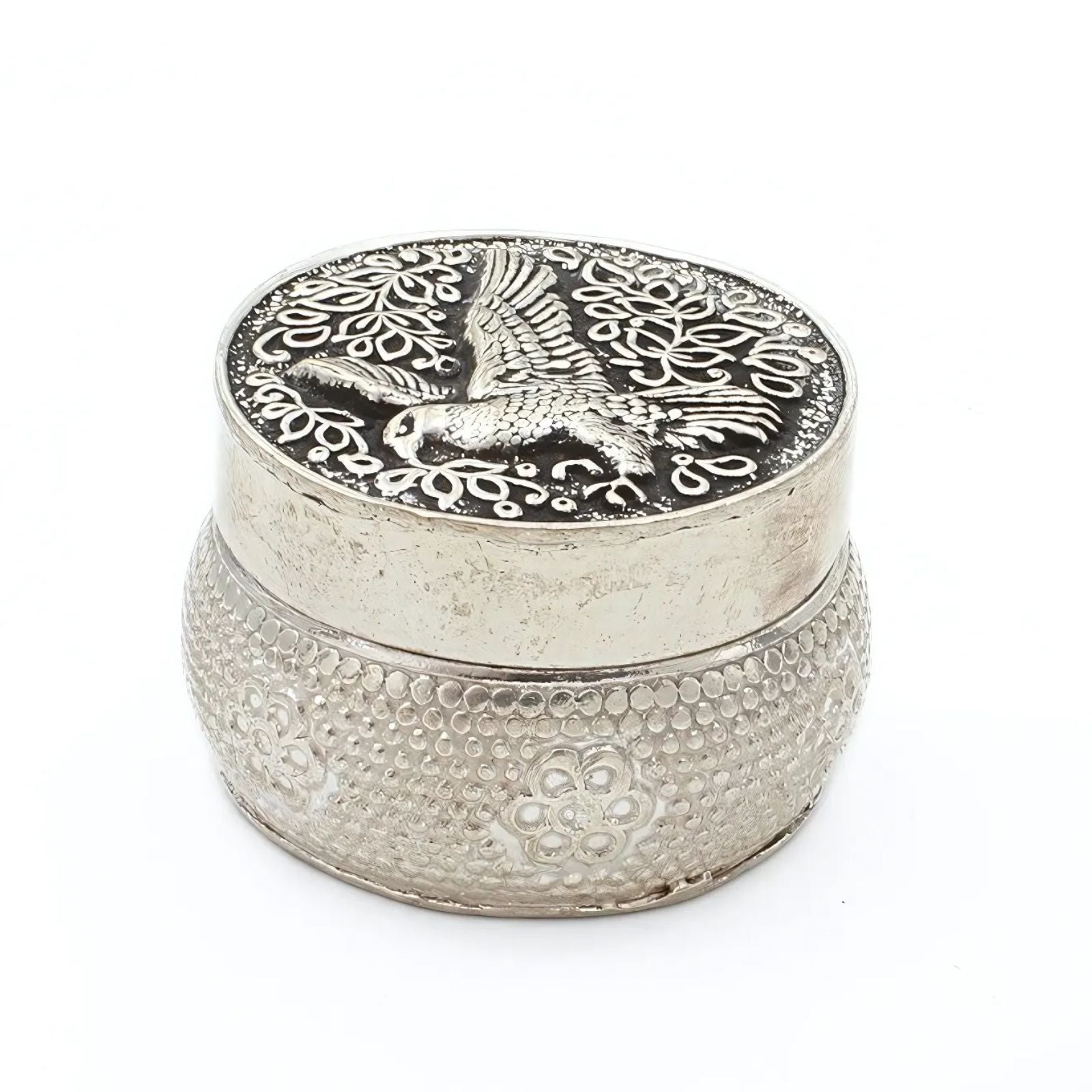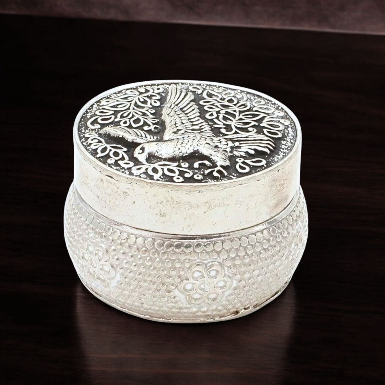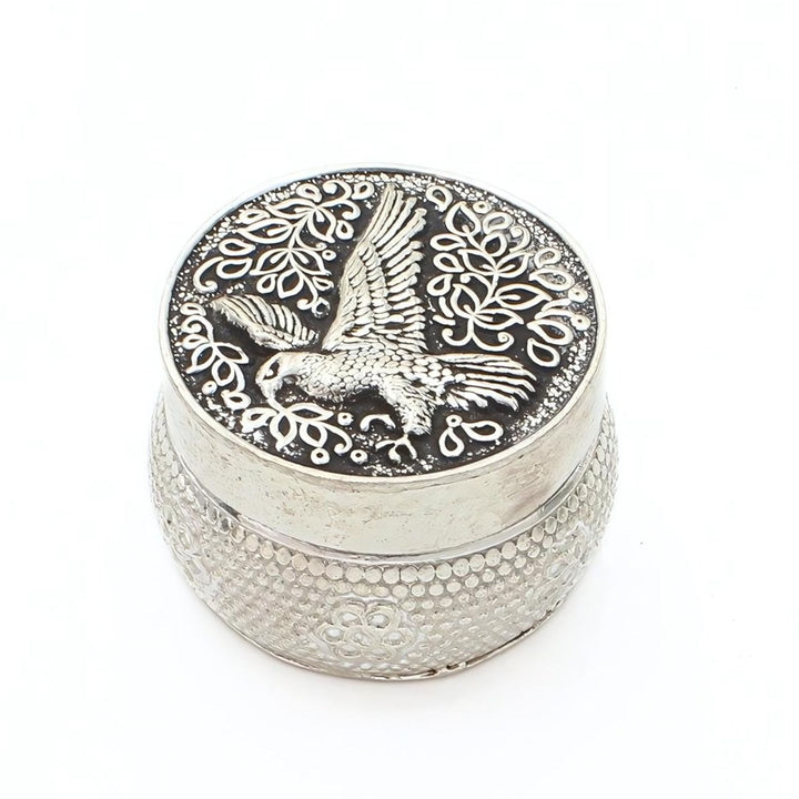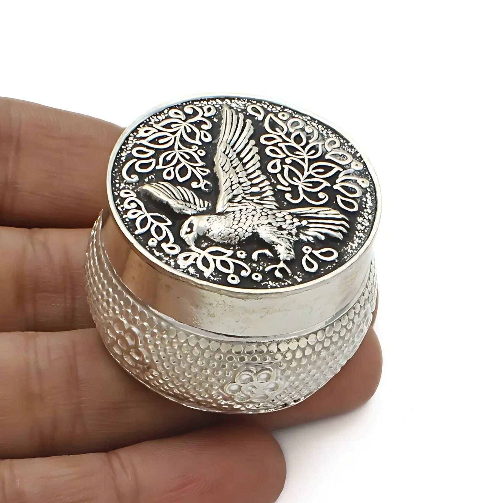 This Real Silver Honey Container showcases an oxidized Eagle design, symbolizing strength and vision. Ideal for storing honey or remedies, it combines traditional artistry with everyday functionality. Crafted to enhance your wellness practices, this container offers both durability and meaningful style.
