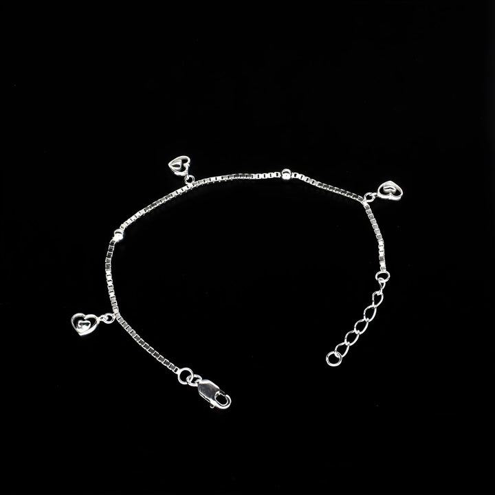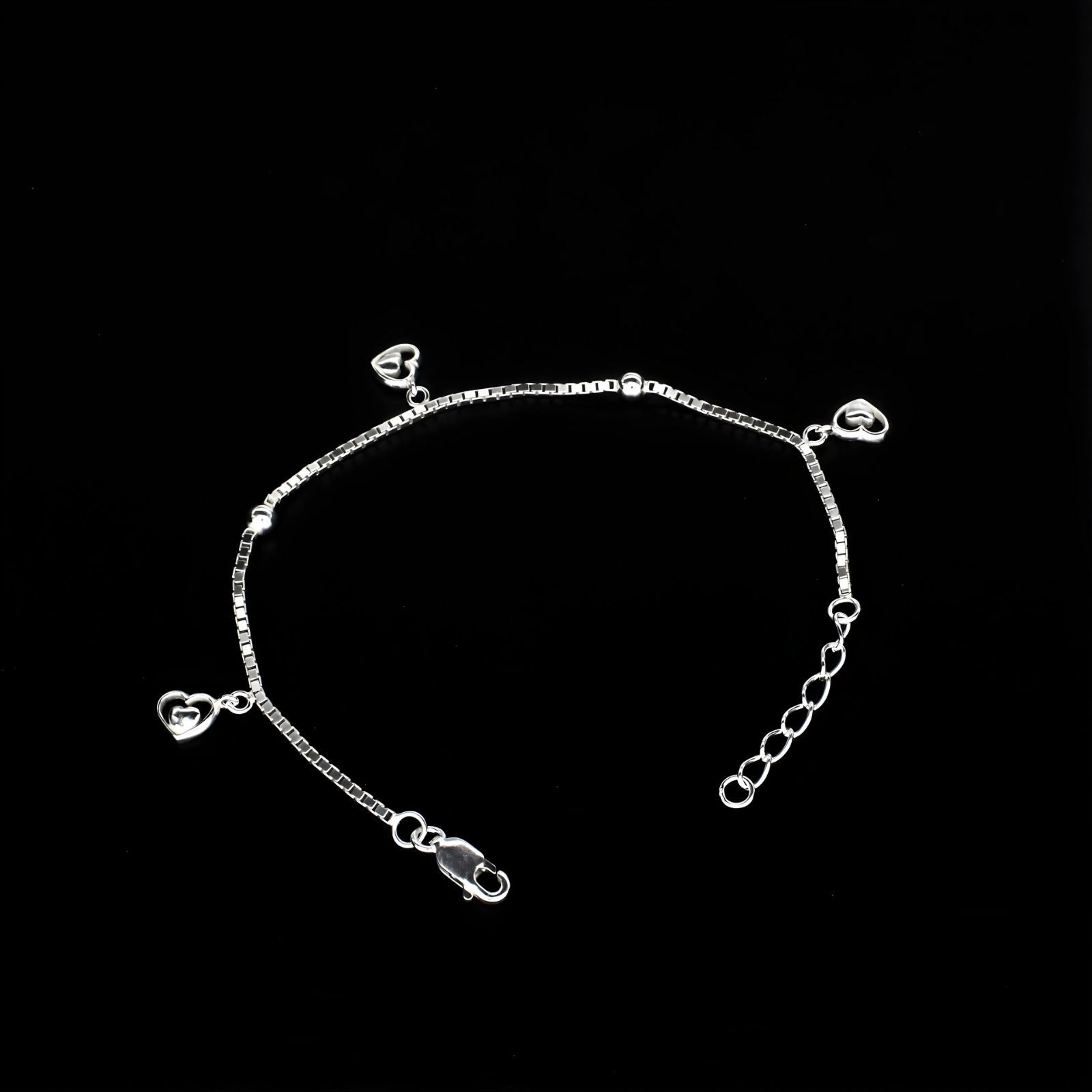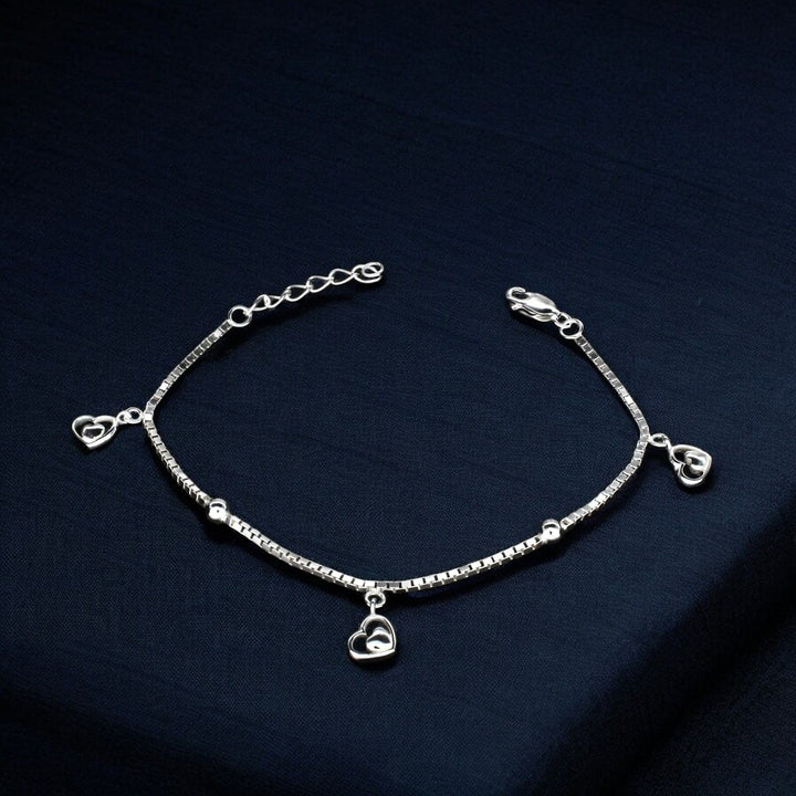 Express your affection with this adorable sterling silver bracelet, showcasing three delicate heart charms that dance gracefully along a refined box chain. Fashioned from premium 925 sterling silver, this charming piece captures the essence of youthful romance and heartfelt emotion. The dangling hearts create a playful movement that catches the light beautifully, while the sturdy box chain provides reliable support. Ideal for gifting to someone you cherish or keeping as a personal reminder of love's importance, this bracelet brings joy and meaning to your everyday style.