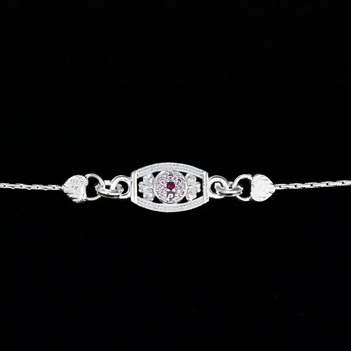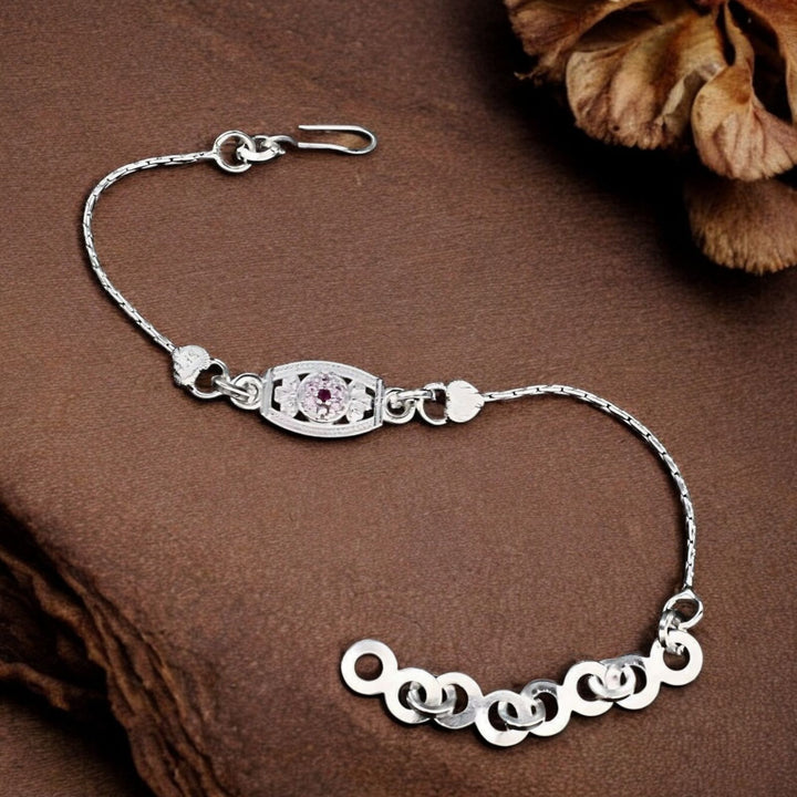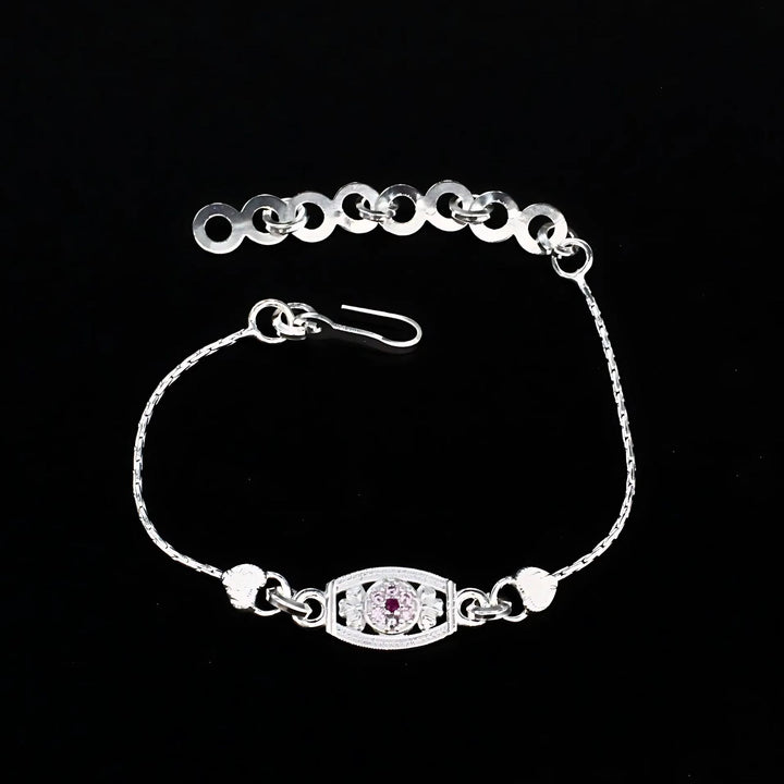 Celebrate the bond of love with this unique, trendy Real Silver Bracelet Rakhi featuring sparkling pink cubic zirconia stones. Measuring 6 inches, it offers a perfect fit and lasting shine. Crafted from genuine silver, this Rakhi combines elegance with durability, making it a meaningful gift to cherish your sibling relationship.