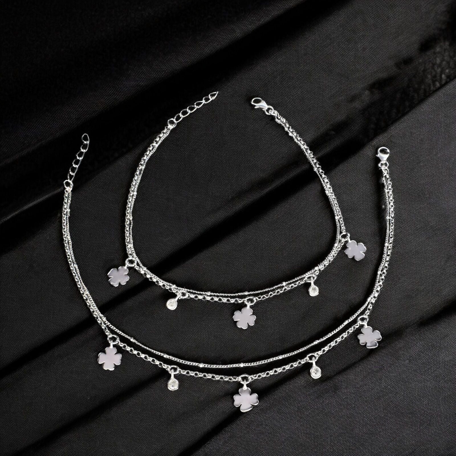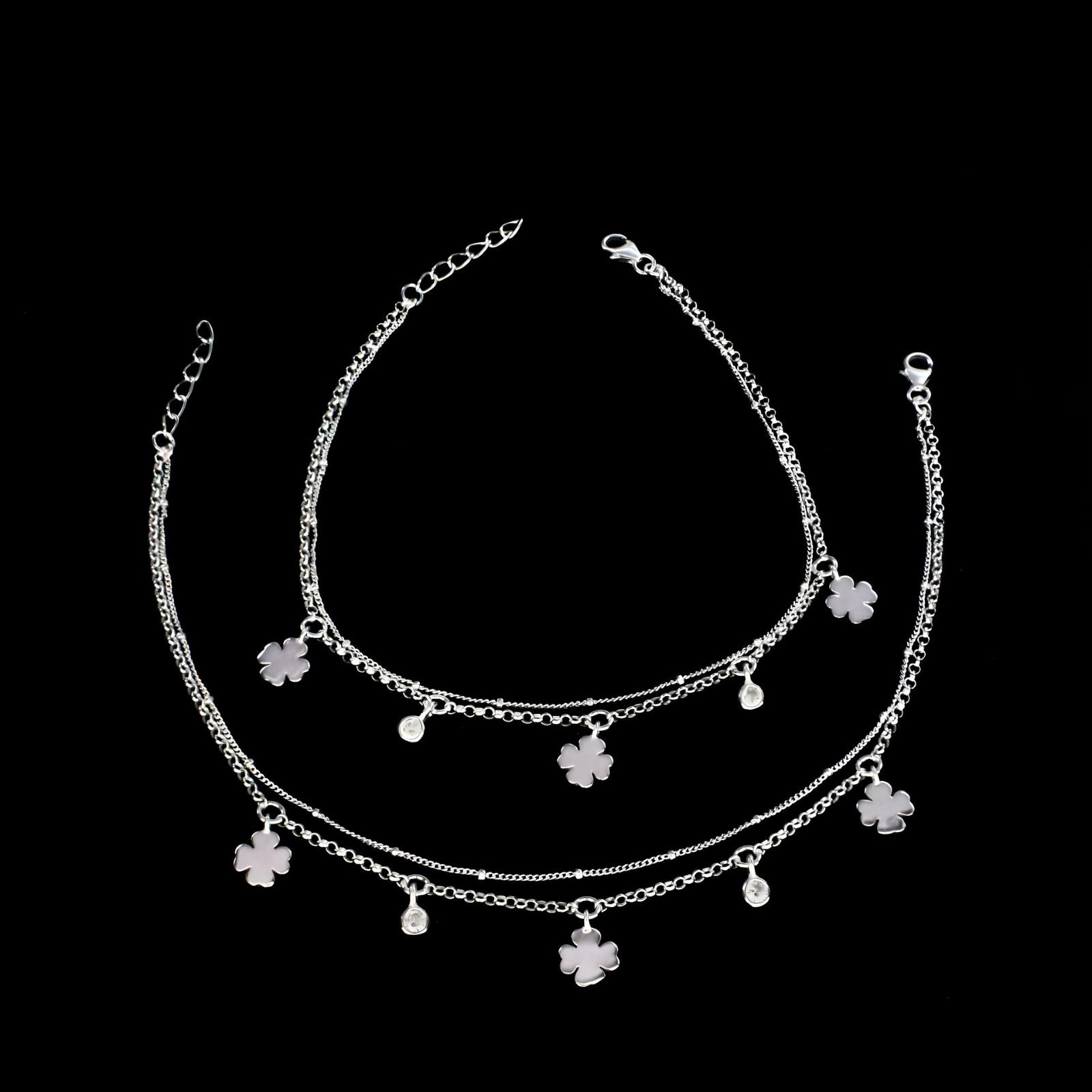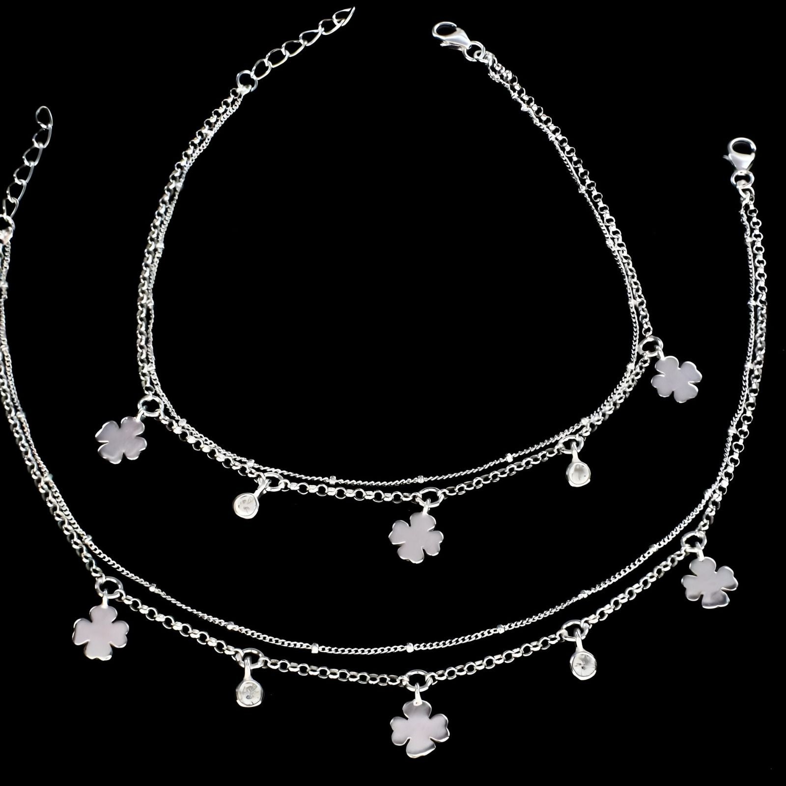 Adorn your ankles with delicate elegance through this charming sterling silver anklet pair. Crafted from 925 sterling silver, each piece features a graceful two-layer design adorned with a four-leaf clover motif and sparkling white cubic zirconia stones. Measuring 10.5 inches, these anklets offer a perfect fit for everyday wear or special occasions. The lightweight construction ensures all-day comfort, while the lustrous finish adds a touch of sophistication to any outfit. Ideal for layering or wearing individually, this pair celebrates timeless beauty with a modern twist.