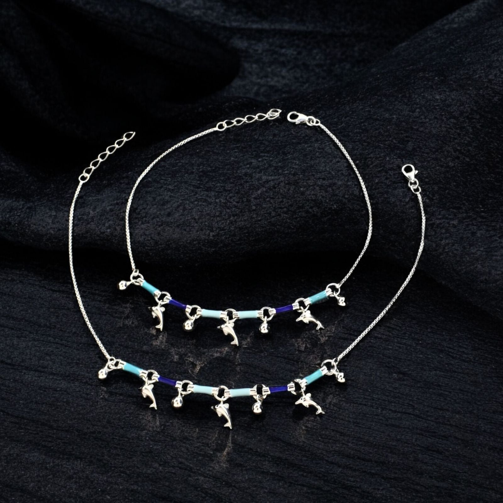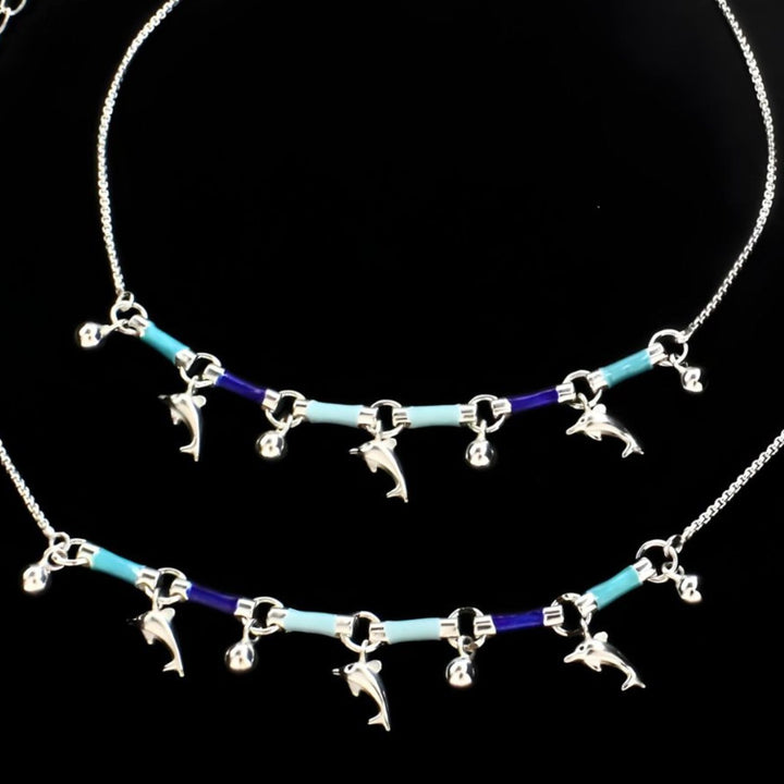 Adorn your ankles with the playful charm of these sterling silver dolphin anklets. Crafted from authentic 925 sterling silver, this pair features delicate dangling dolphin charms that catch the light with every step. Perfect for adding a whimsical touch to your everyday style or special occasions, these 10.4" anklets offer comfortable wear and timeless appeal. Ideal for those who love ocean-inspired jewelry and meaningful accessories that celebrate nature's grace.