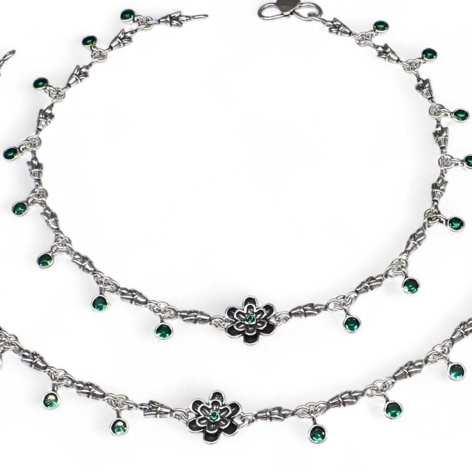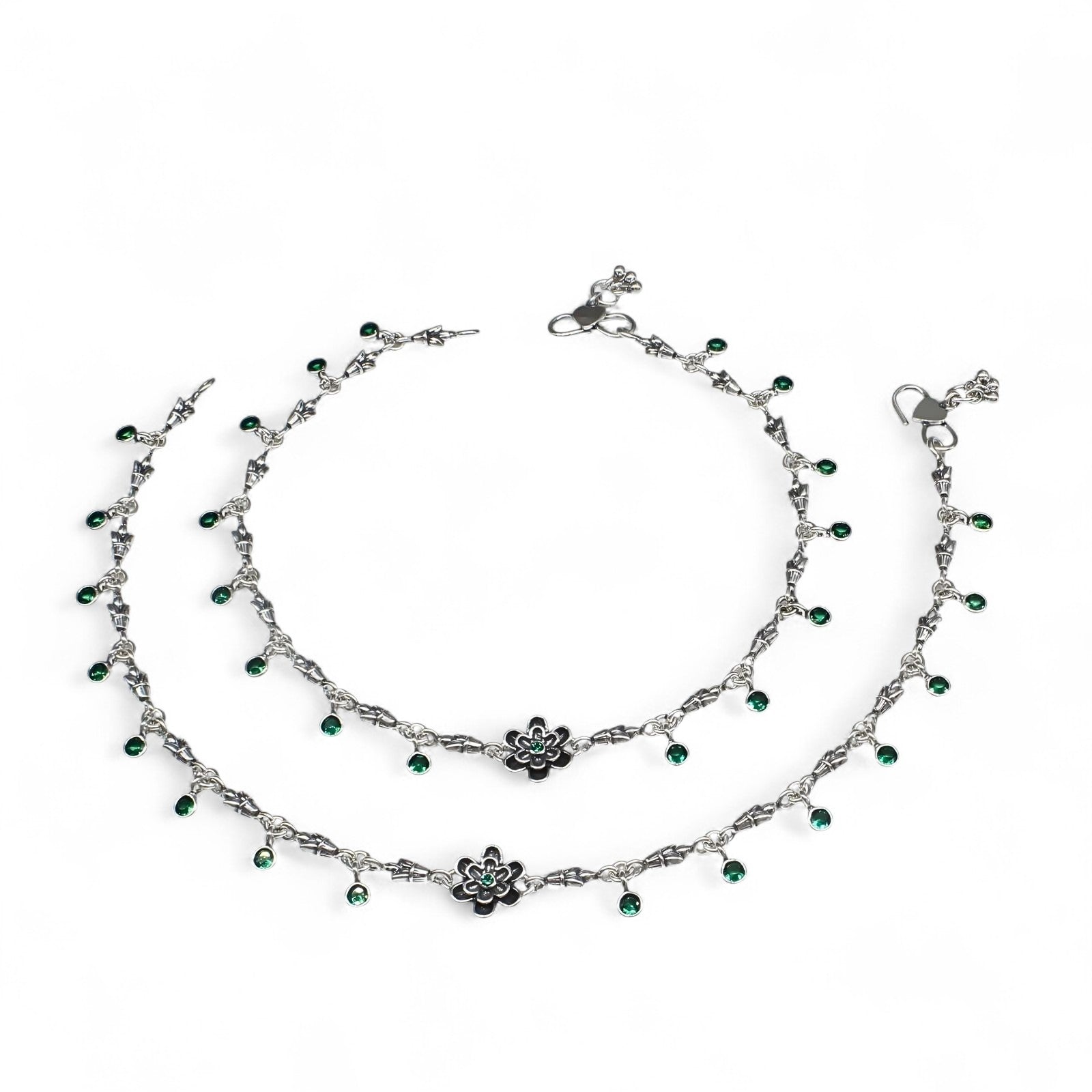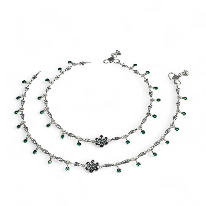 Adorn your ankles with the timeless elegance of this 925 sterling silver anklet pair. Featuring stunning green cubic zirconia stones set in an oxidized finish, each piece showcases intricate floral detailing that captures light beautifully. At 10.3 inches, this pair offers the perfect fit for most wearers. The combination of quality craftsmanship and affordable luxury makes these anklets an ideal choice for daily wear or special occasions. Celebrate your style with jewelry that reflects your refined taste and appreciation for authentic design.