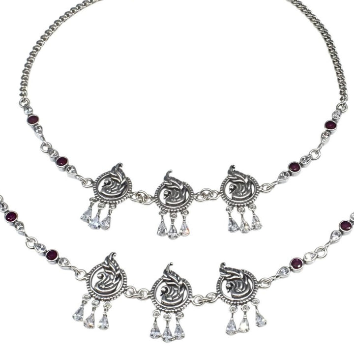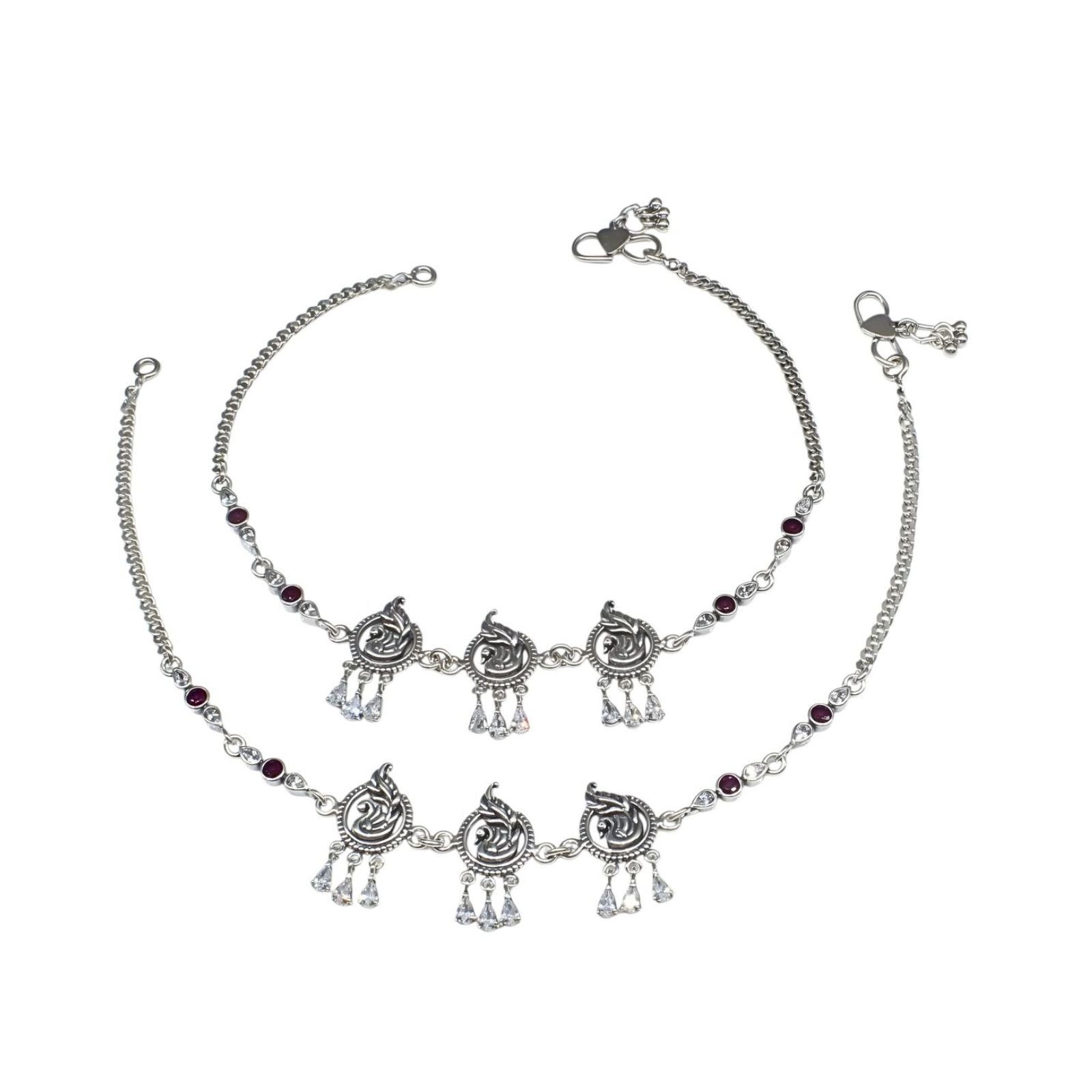 Embrace bohemian elegance with this stunning sterling silver anklet pair. Crafted from 925 sterling silver with an oxidized peacock design, each piece features sparkling pink and white cubic zirconia stones that catch the light beautifully. The 10-inch length offers a comfortable fit for most wearers. Perfect for layering or wearing solo, these anklets bring a touch of artistic flair to any outfit. The intricate peacock motif adds cultural charm, while the quality craftsmanship ensures lasting wear. Ideal for festivals, casual wear, or special occasions.