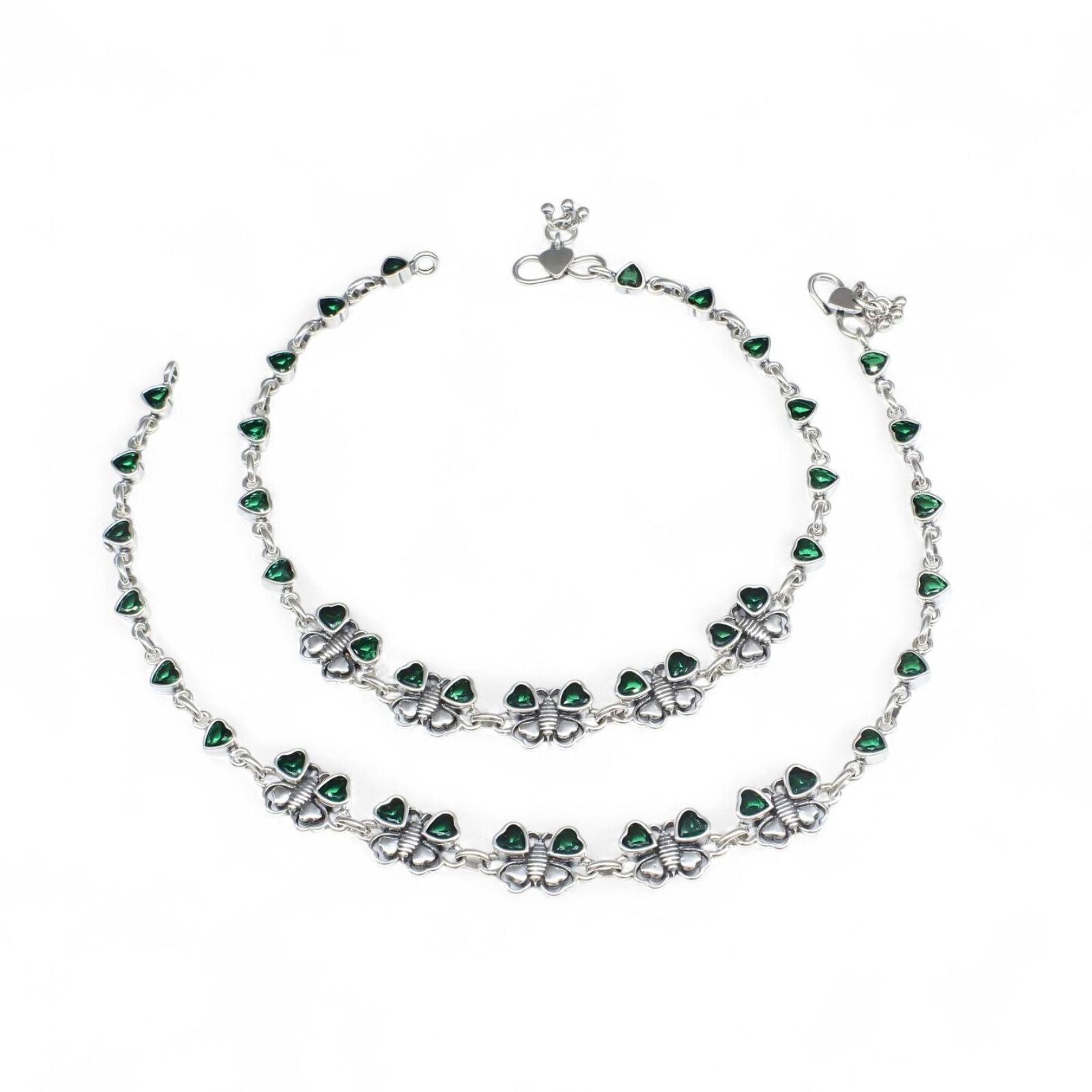 Embrace delicate elegance with this charming butterfly anklet pair, crafted from authentic 925 sterling silver. Each piece features sparkling green cubic zirconia stones set in an oxidized finish that adds vintage sophistication. Measuring 10.5 inches, these anklets offer a comfortable fit for most wearers. The butterfly motif symbolizes transformation and grace, making them perfect for everyday wear or special occasions. Pair them together for a coordinated look, or wear individually for subtle spark