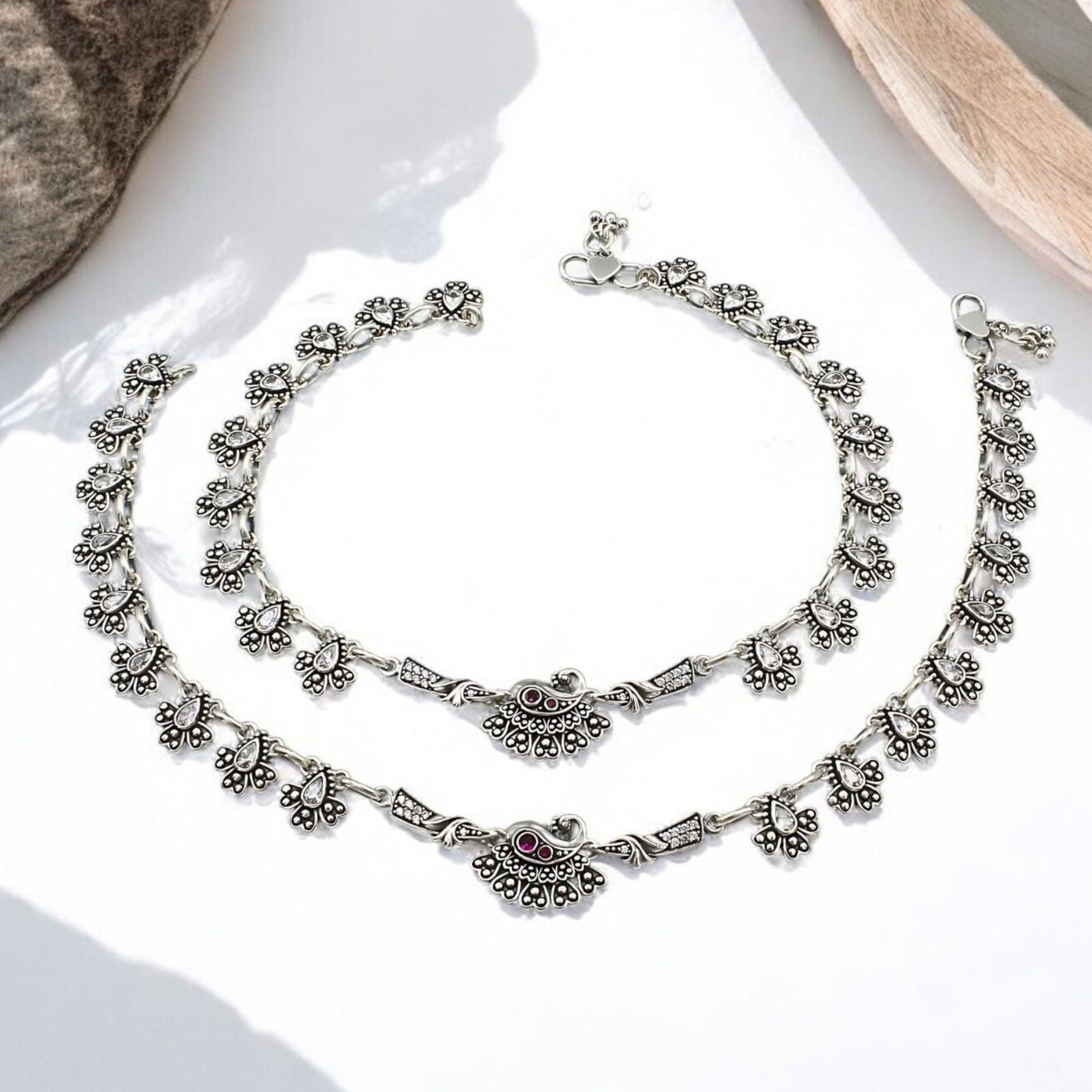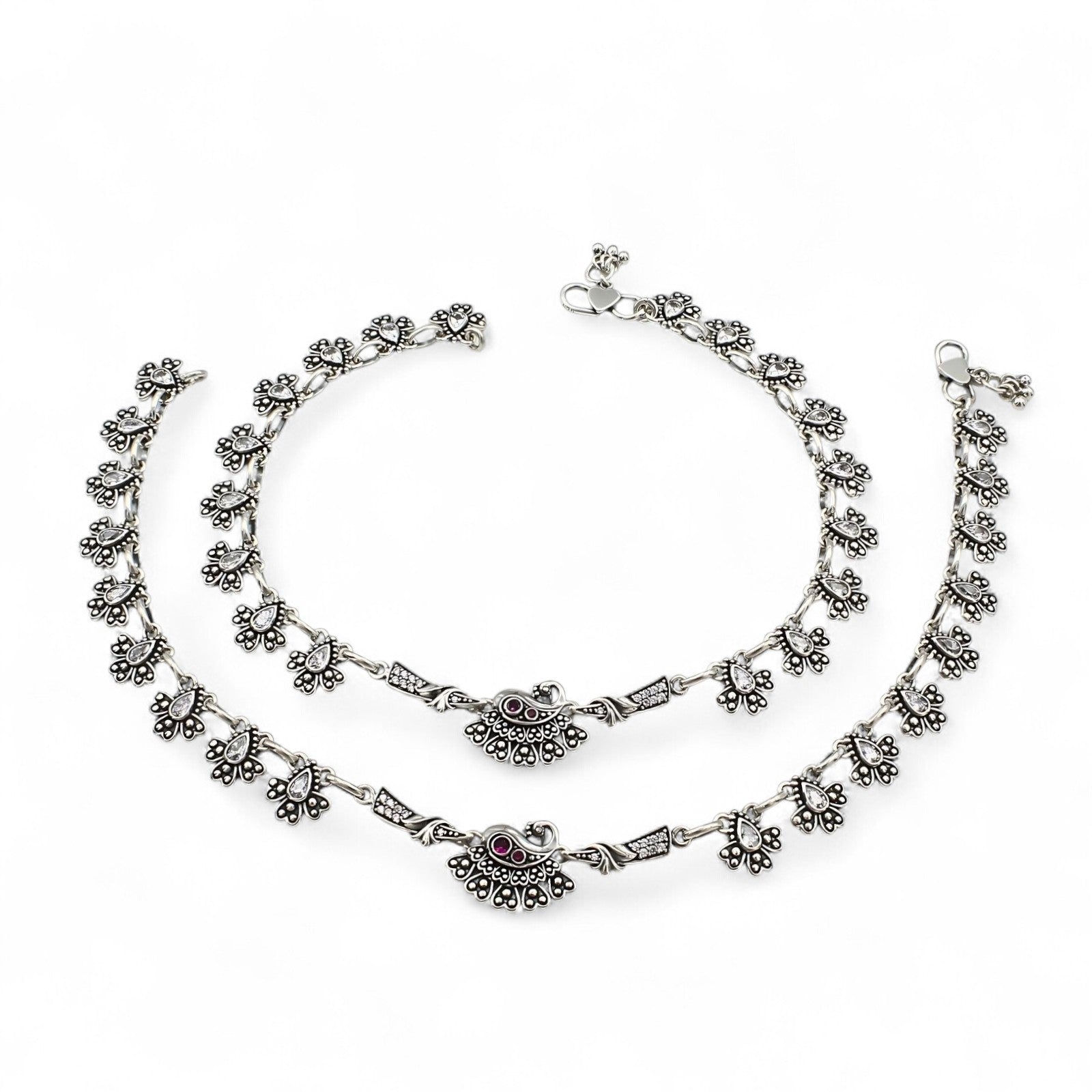 Enhance your style with this flower design anklet pair crafted from 925 Sterling Silver, featuring pink and white cubic zirconia accents in an oxidised peacock motif. Measuring 10.3 inches, these anklets offer a comfortable fit while adding a delicate, artistic touch to your look. Perfect for everyday wear or special occasions, they bring elegance and charm to every step.
